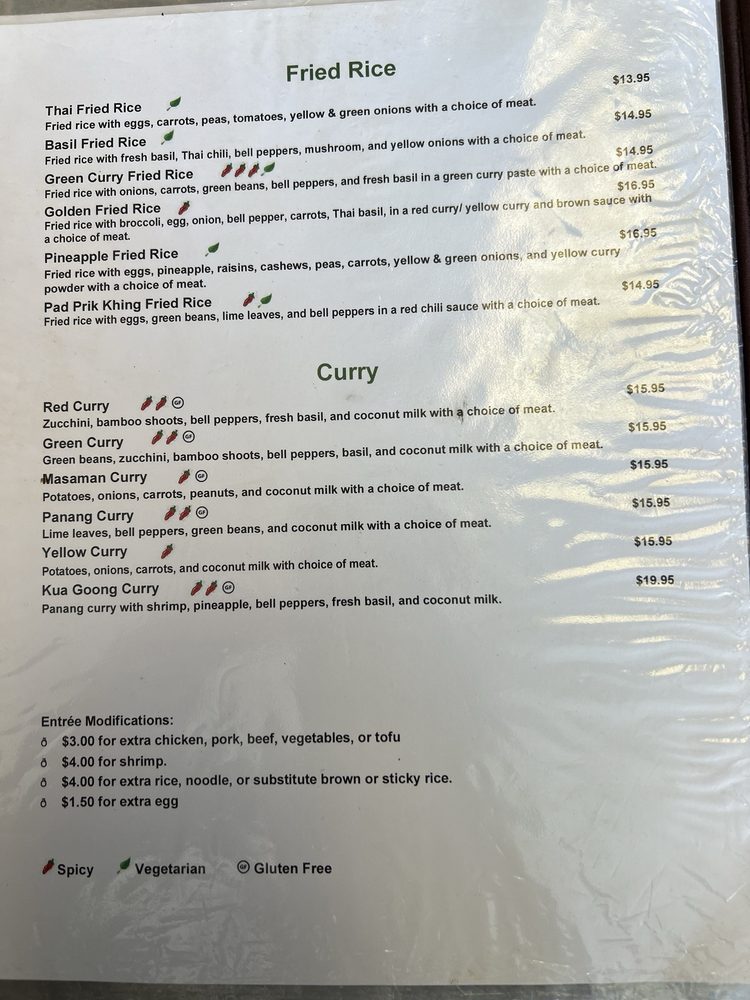 Fried rice with broccoli, egg, onion, bell pepper, carrot, and Thai basil in red curry/yellow curry and brown sauce with a choice of meat. Spicy.