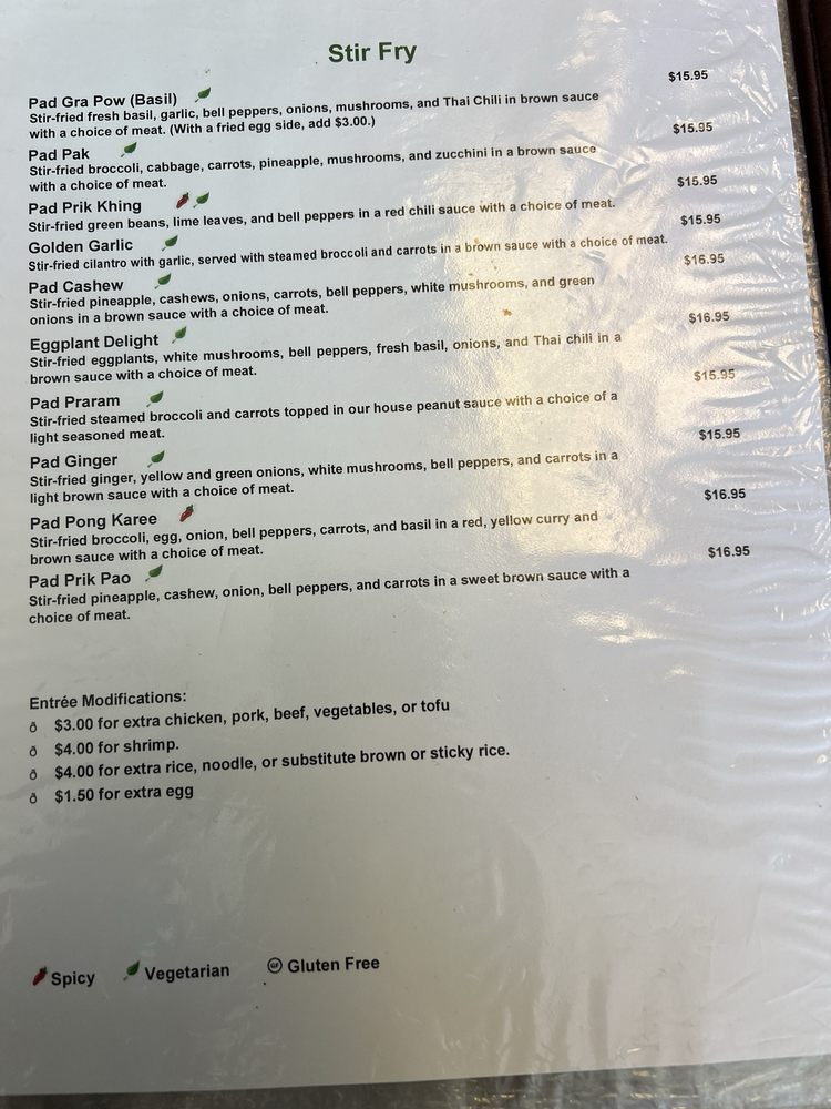 Basil. Stir-fried fresh basil, garlic, bell peppers, onions, mushrooms, and Thai chili in a brown sauce with a choice of meat. Served with a fried egg side for an additional charge. Spicy. Vegetarian.