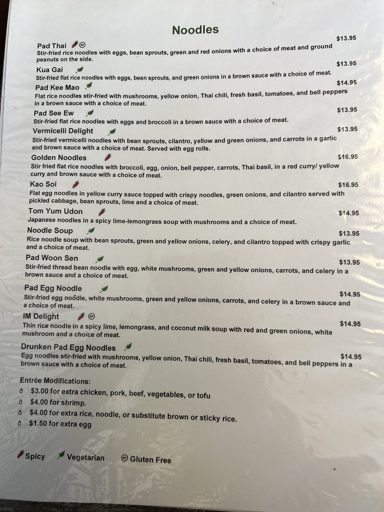 Stir-fried flat rice noodles with broccoli, egg, onion, bell pepper, carrots, and Thai basil in red curry/yellow curry & brown sauce with a choice of meat. Spicy.