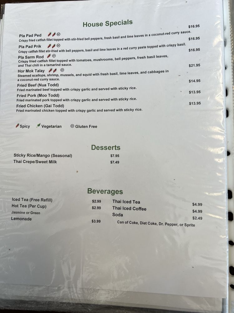 Crispy fried catfish fillet topped with tomatoes, mushrooms, onions, bell peppers, fresh basil leaves, and Thai chili in a tamarind sauce. Spicy. Gluten free.